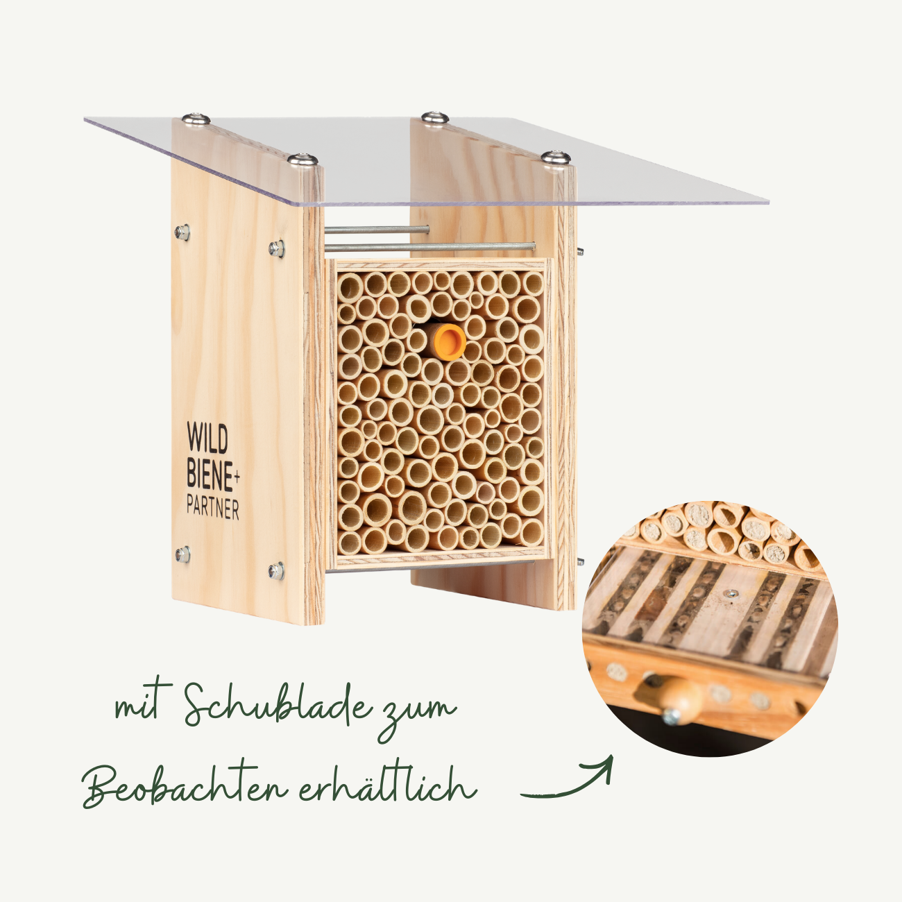 Selon les espèces, les abeilles sauvages utilisent différentes bases de nidification pour se reproduire. Les sols ouverts, pauvres et peu exploités sont particulièrement importants pour les nombreuses espèces rares qui nichent au sol. Le bois pourri et les tiges de plantes sèches sont également des ressources de nidification extrêmement précieuses. Avec notre BeeHome, tu peux également favoriser plus de vingt espèces et les y observer merveilleusement.