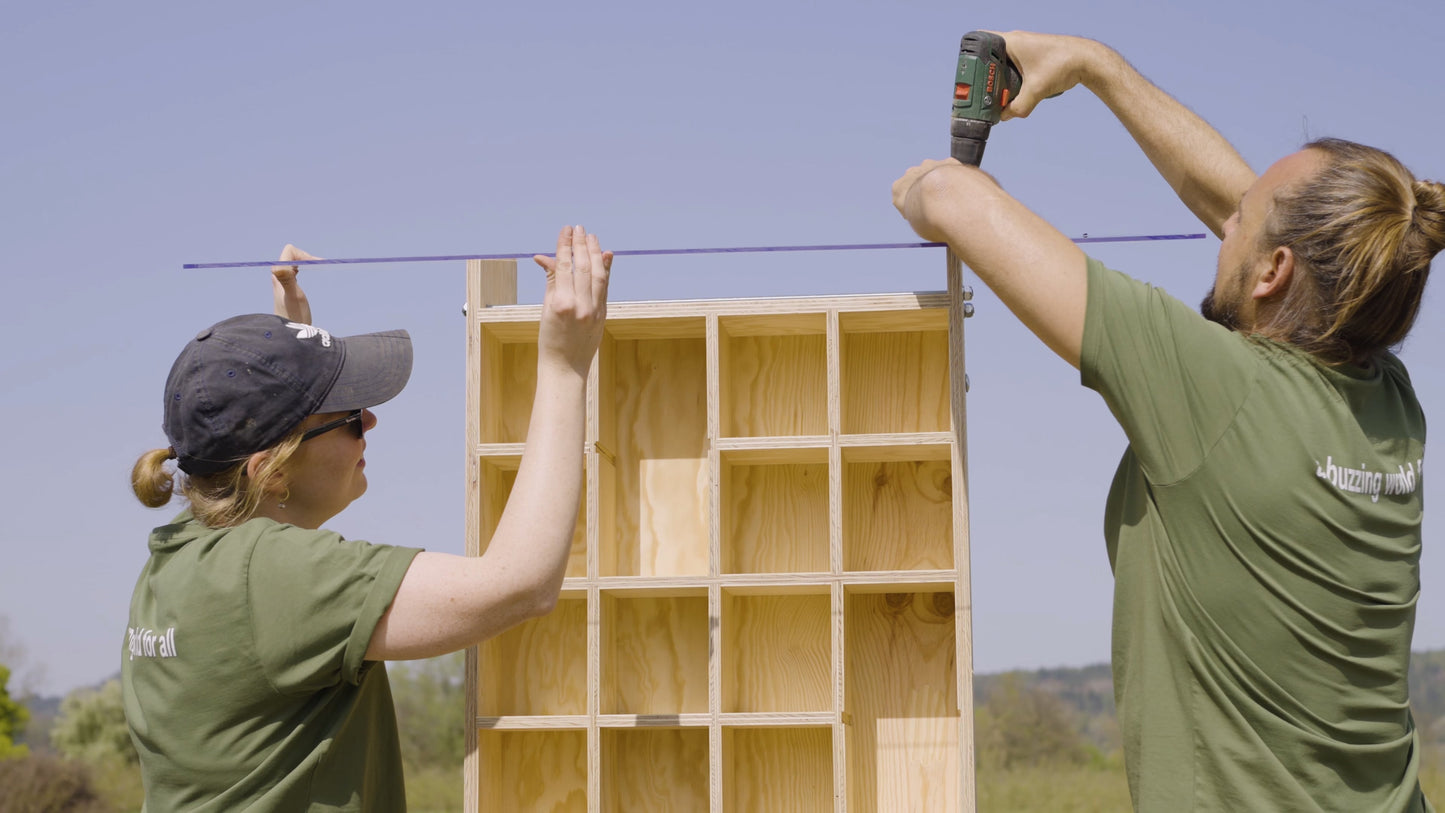 Une maison d'abeilles sauvages diversifiée "BeeHome Premium" sera installée sur des habitats d'abeilles sauvages sélectionnés. Le BeeHome Premium est une maison pour abeilles sauvages spécialement conçue pour les abeilles sauvages indigènes. Il se caractérise par diverses structures de nidification pour les espèces d'abeilles sauvages les plus diverses et permet de promouvoir et de découvrir la fascinante diversité des abeilles sauvages.