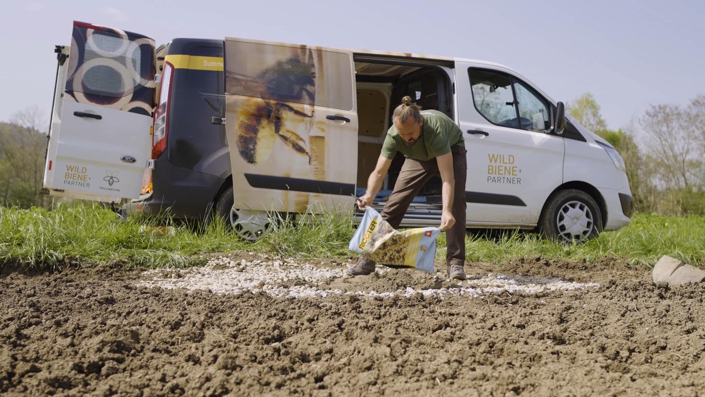 Afin de favoriser les espèces d'abeilles sauvages et d'autres insectes qui utilisent le sol comme lieu de nidification et qui ont besoin de conditions spécifiques pour cela, une surface de sable a également été aménagée. Alors que nos BeeHomes sont le foyer idéal pour les nicheurs dits de cavités, les lentilles de sable offrent une possibilité de nidification aux abeilles sauvages qui nichent au sol. Comme de nombreuses espèces d'abeilles sauvages menacées appartiennent à ce groupe, il est très important de promouvoir leurs habitats. Pour la surface de sable, nous utilisons du sable pour abeilles sauvages de RICOTERqui a été développé en collaboration avec nous.
