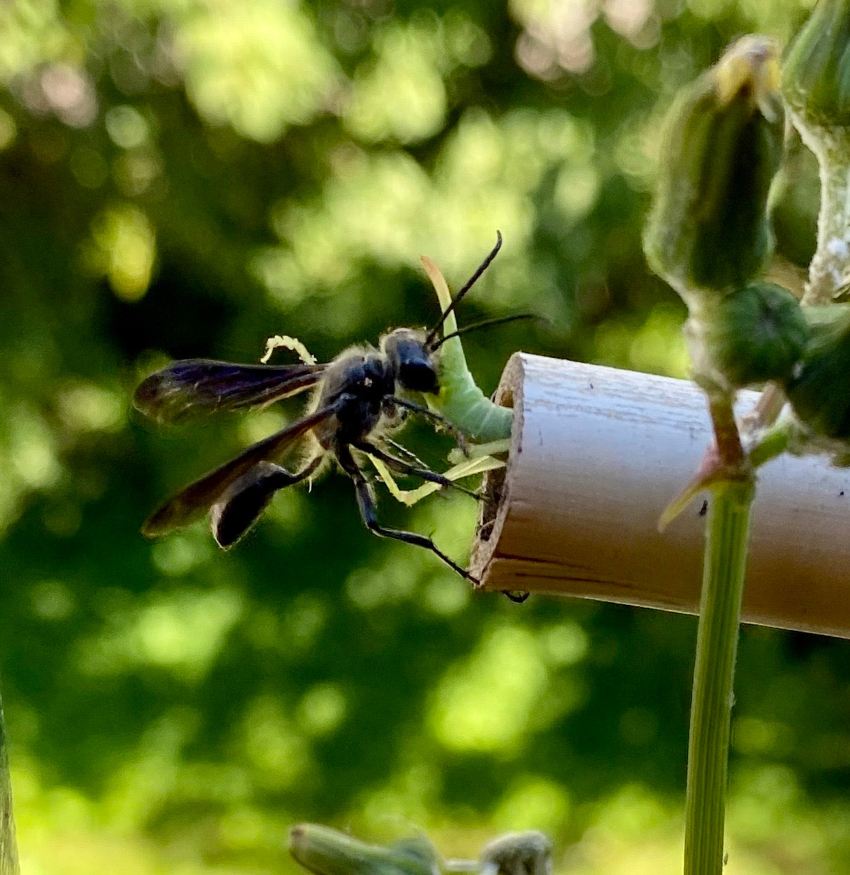 Cette espèce de guêpe n'est présente chez nous que depuis les années 1960 et a été importée d'Amérique. Entre-temps, elle s'est largement répandue et on peut l'observer de plus en plus souvent sur les aides à la nidification. Si l'on a de la chance et de la patience, on peut l'observer en train de ramasser des brins de paille autour de son nid.