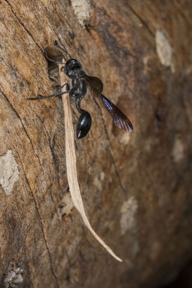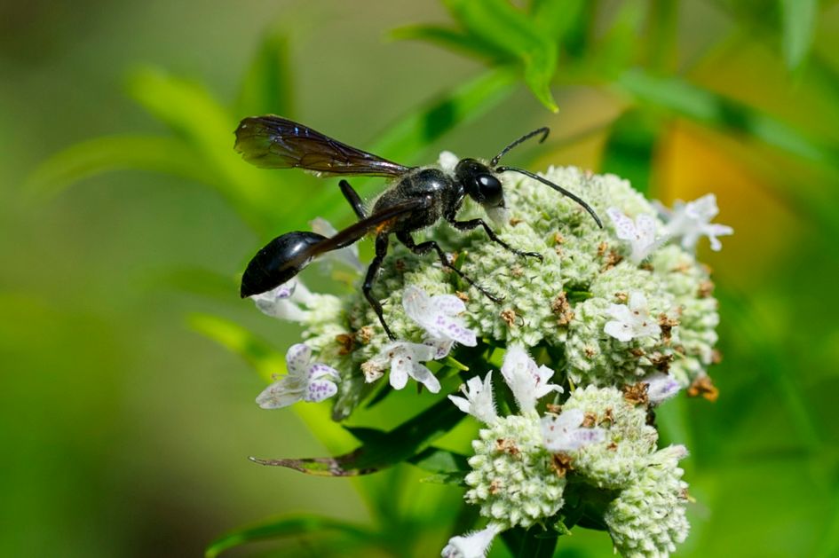 Le grillon bleu acier est une espèce de guêpe fouisseuse. Elle mesure 15-20 mm et est d'un noir profond avec une taille de guêpe forte