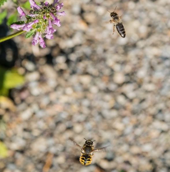 Outre leur matériau de construction particulier, les abeilles lainières (en particulier Anthidiummanicatum,l'abeille laineuse des jardins) se distinguent par leur comportement territorial. Les mâles occupent de petits territoires - souvent de moins d'un mètre carré avec des plantes comme le lierre ou la sauge - et les défendent énergiquement contre les autres insectes. Ils patrouillent constamment de haut en bas, en s'arrêtant toujours à un endroit en l'air (ce qui est très rarement observé chez les abeilles). Les autres insectes qui pénètrent sur le territoire attaquent immédiatement les abeilles lainières. Elles percutent les gros insectes comme les abeilles mellifères et les bourdons par le côté et les attaquent avec leurs mandibules ou les trois épines pointues de leur abdomen. Sur la photo, tu peux voir comment un mâle d'abeille laineuse chasse une abeille mellifère de sa zone d'accouplement.
